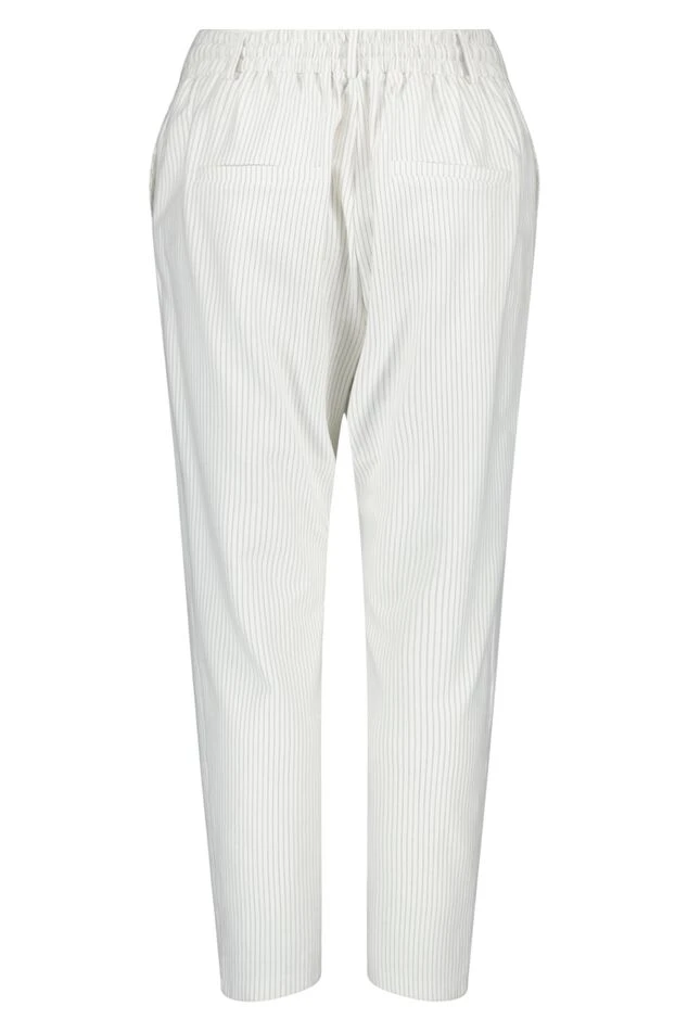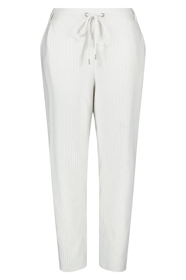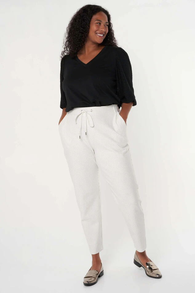 Deze broek is een perfecte combinatie van comfort en stijl, met krijtstrepen die de broek een trendy uitstraling geven. Het strikkoord zorgt voor een perfecte pasvorm op maat. Gemaakt van jersey met stretch biedt de broek een comfortabele en flexibele draagervaring. Of je het nu combineert met een blouse voor een formele look of met een casual top voor een meer ontspannen uitstraling, deze broek is geschikt voor elke gelegenheid.