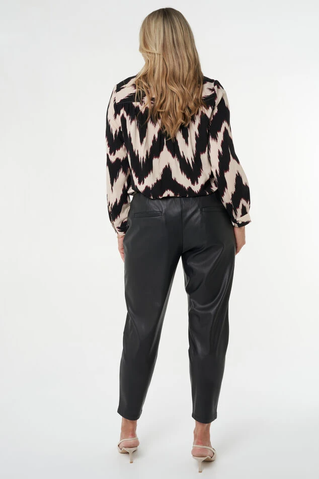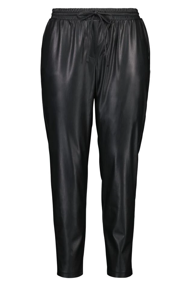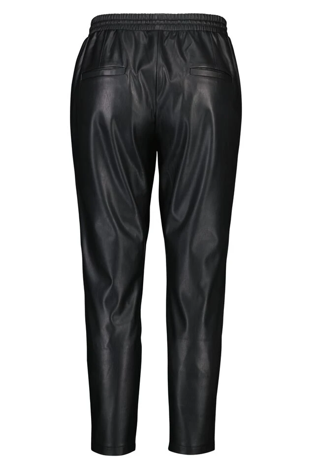 Comfy & stoer! Een imitatieleren joggingbroek met twee steekzakken en een elastische tailleband. De broek heeft rechtvallende pijpen.